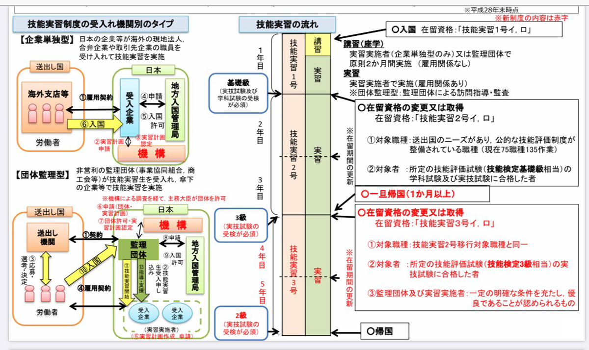 技能実習制度は、出入国管理及び難民認定法別表第一の二に定める「技能実習」の在留資格により日本に在留する外国人が報酬を伴う実習を行う制度である。企業等の実習実施機関が海外の現地法人、合弁企業や取引先企業の職員を受け入れて技能実習を実施する企業単独型と、商工会等の営利を目的としない監理団体が技能実習生を受け入れ、傘下の実習実施機関で技能実習を実施する団体監理型に大別することができる。